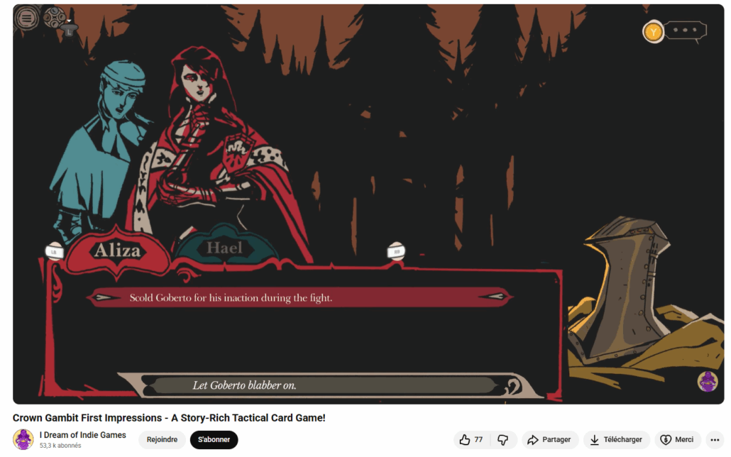 Crown Gambit est un jeu narratif avec aux combats de cartes tactiques qui se déroule dans un univers dark-fantasy. Développé par Wild Wits et édité par Playdigious, il est sorti le 18 juin 2025. A noter : l’artiste Gobert a dessiné les illustrations à la main !