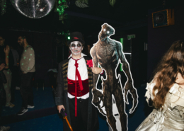 Pour l’ambiance immersive nous avons misé sur un gâteau d’anniversaire sanglant (pour célébrer les 10 ans de Piece of Cakes Studio), un photobooth avec les accessoires loufoques dont les personnages peuvent s’équiper dans le jeu… et même des monstres tapis dans l’obscurité.