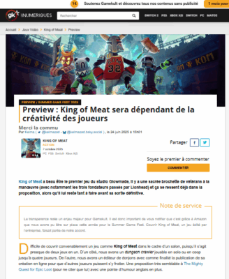 Campagne de relations presse en France pour King of Meat, édité par Amazon Game Studios.